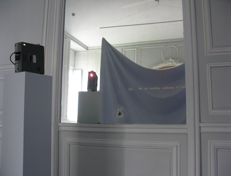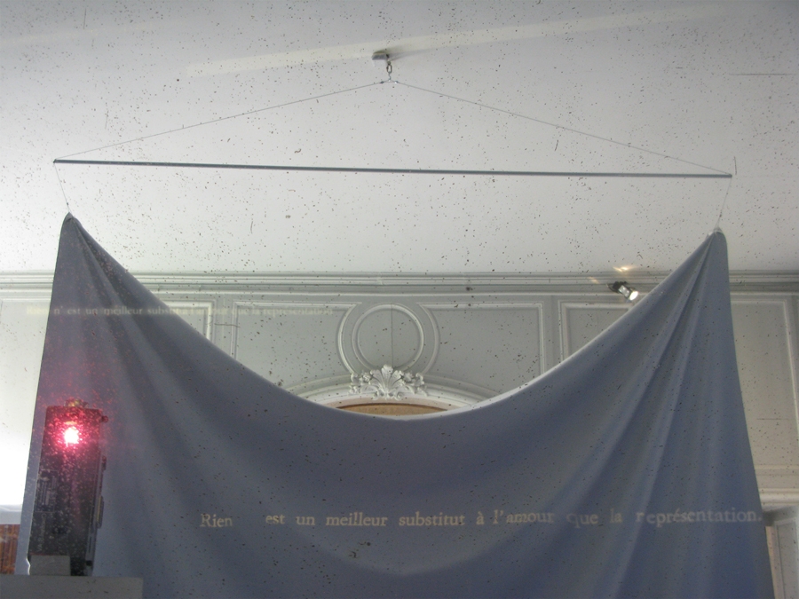 2009, toile suspendue imprimée, projecteur de diapositives, diapositive avec texte, miroir