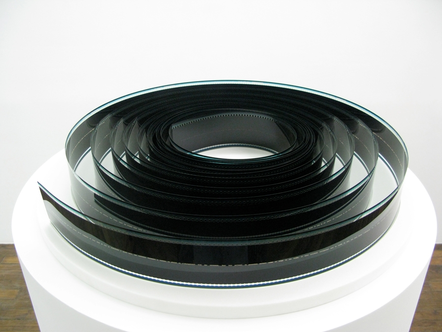 The action described in the passage from The lliad of Homer fashions the shape of the work. There is no question of screening this film, which otherwise would be a horizontal line film, white and sparkling lasting a few seconds, but rather to invite the viewer to wander, literally to make him turn around the film like the chariots in the arena. Therefore, the whole piece is constructed as if the text which became inseparable from the film had generated its own shape - in this case, the one of a spiral making visible the rolled text.