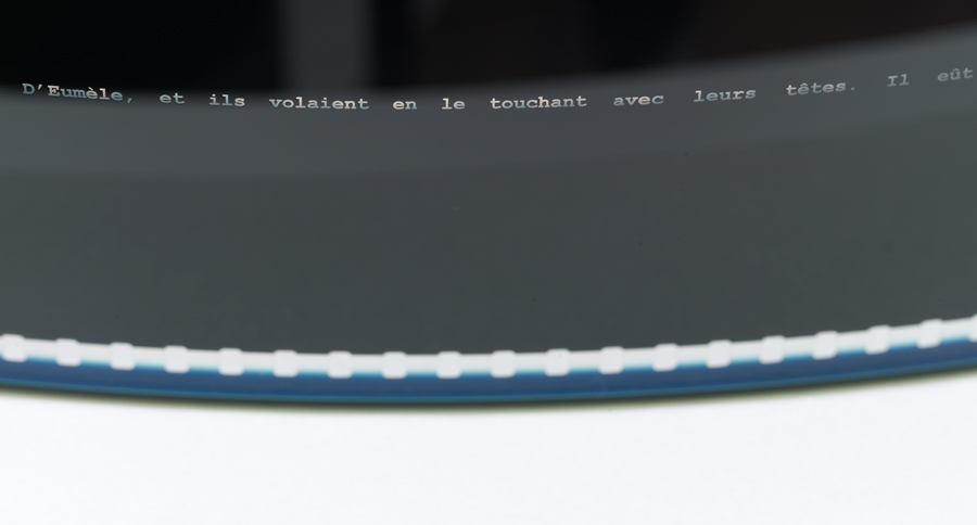The piece is a continuous horizontal line, composed by a kinescoped text printed on a film 11 metres long . This is a 15/70mm film, side-scrolling, the largest existing format, used for a few blockbusters and projections in domes or “imax” rooms.