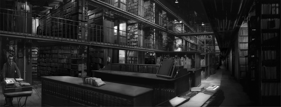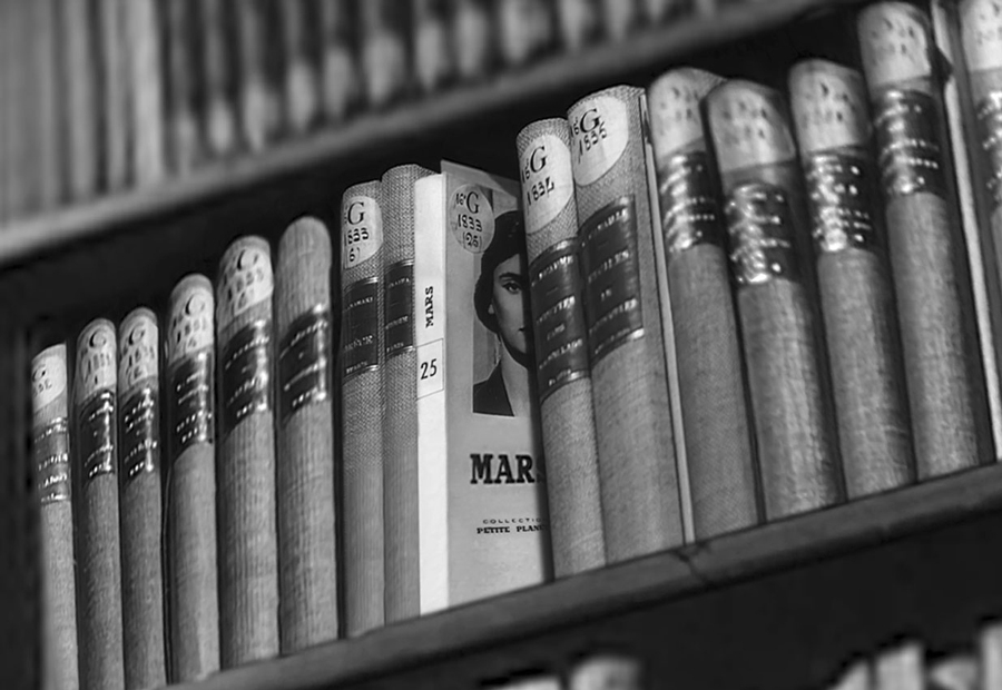 En son sein se joue un autre mouvement, celui d’un livre dont on suit la trajectoire : il s’agit d’un hypothétique ouvrage de vulgarisation astronomique sur la planète Mars, qui semble y effectuer une boucle, passant des étagères au chariot sur lequel le livre est déplacé. Le livre dessine une ligne courbe dans l’espace perspectif, laquelle, au lieu de se refermer, semble alors retrouver la ligne fuyante du point de fuite central (le livre, comme plus petite unité et brique de la bibliothèque, constitue le point de netteté de la photographie). L’image d’un temps astronomique, cyclique, converge, dans cette conjonction opportune, avec l’image du temps linaire de cette bibliothèque-monde.