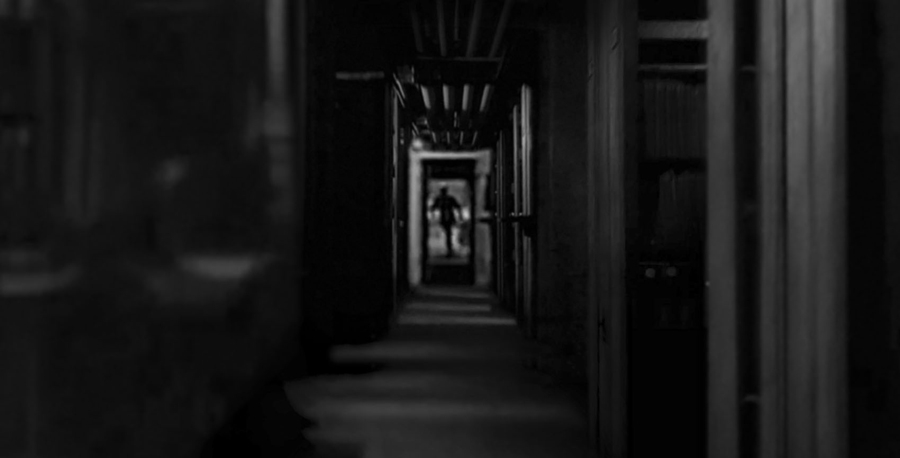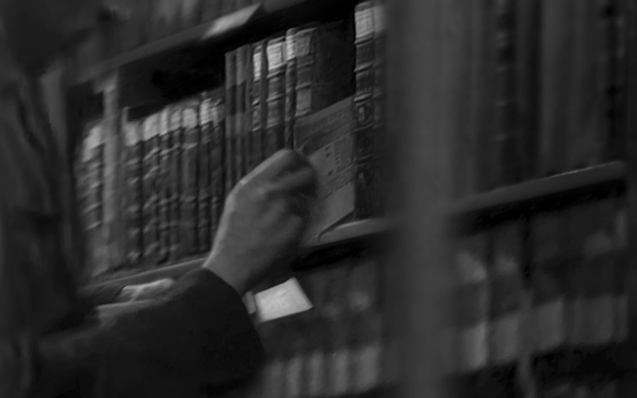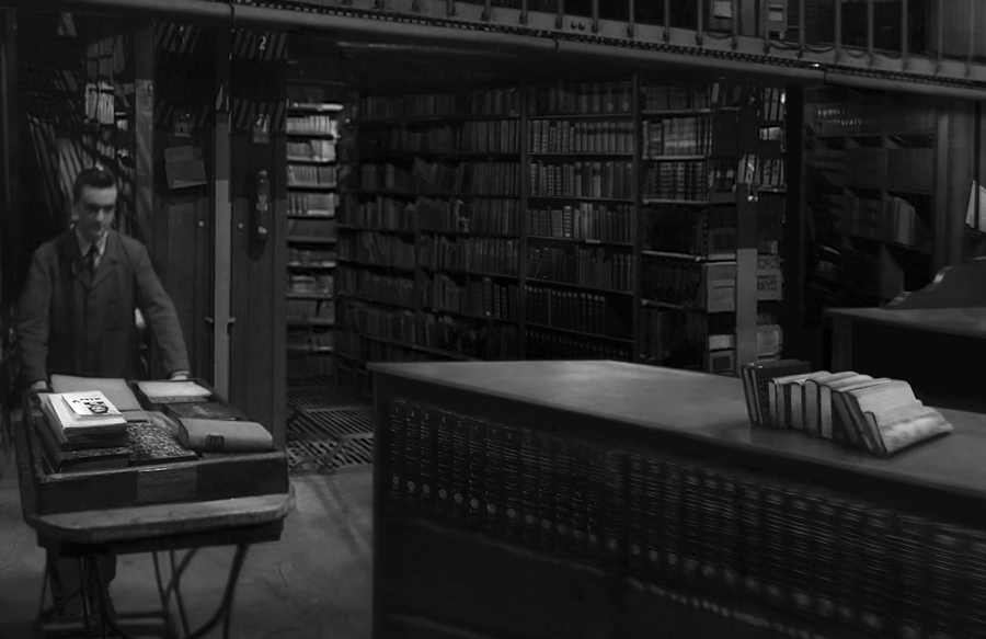 La photographie se développe selon une perspective à deux points de fuite (deux figures humaines - plus exactement deux positions d’un même personnage...) ; perspective qui correspond au temps linéaire de cette accumulation de savoir, tels ces infinis rayonnages de livres, qui s’abîment vers la silhouette atomisée de l’homme disparaissant dans l’encadrement d’une porte.