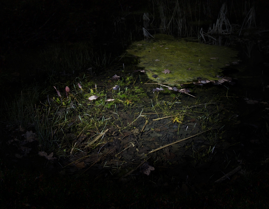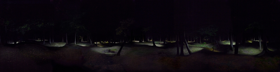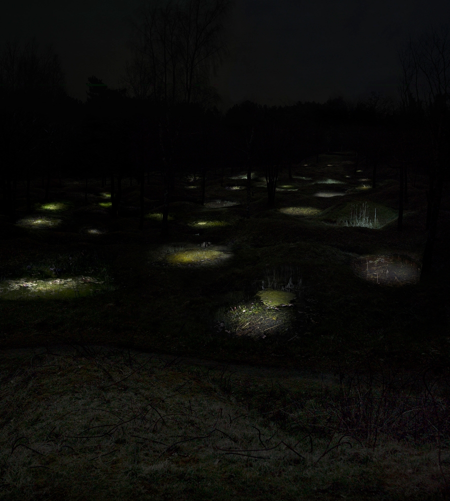 Intitulé Nocturne (été), ce panorama photographique est le résultat d’un long travail photographique mené de nuit, sur d’anciens sites militaires de Verdun éclairés à la torche. Assemblage de plusieurs prises de vues, l’œuvre offre ainsi une mise en lumière - au sens littéral du terme - des aspérités du sol et des écosystèmes qui se sont progressivement formés dans les impacts laissés par les bombes. La lumière y joue un double rôle ; en même temps qu’elle opère une sorte de reconstitution mémorielle des bombardements de la Première Guerre mondiale elle vient sublimer la vie qui reprend. Au travers d’une lecture quasi topographique, Julien Audebert nous propose ainsi un témoignage matériel des traces de notre histoire.