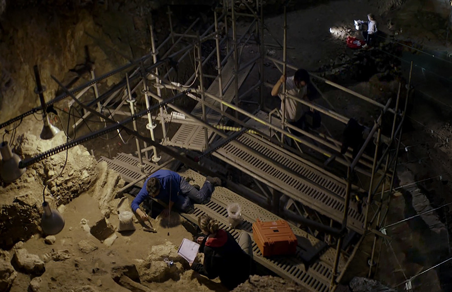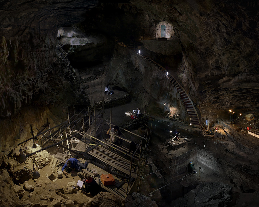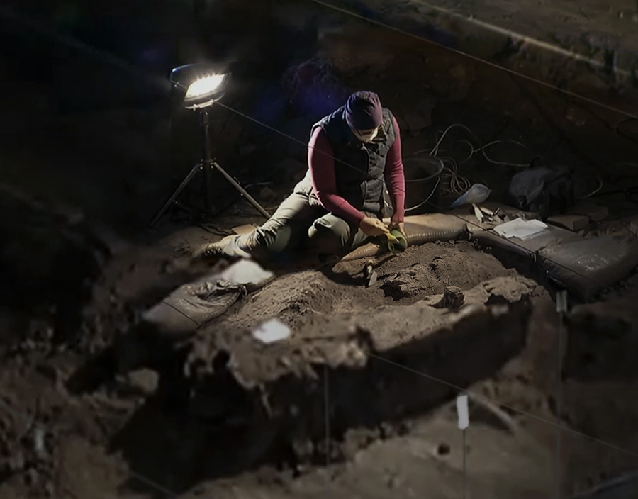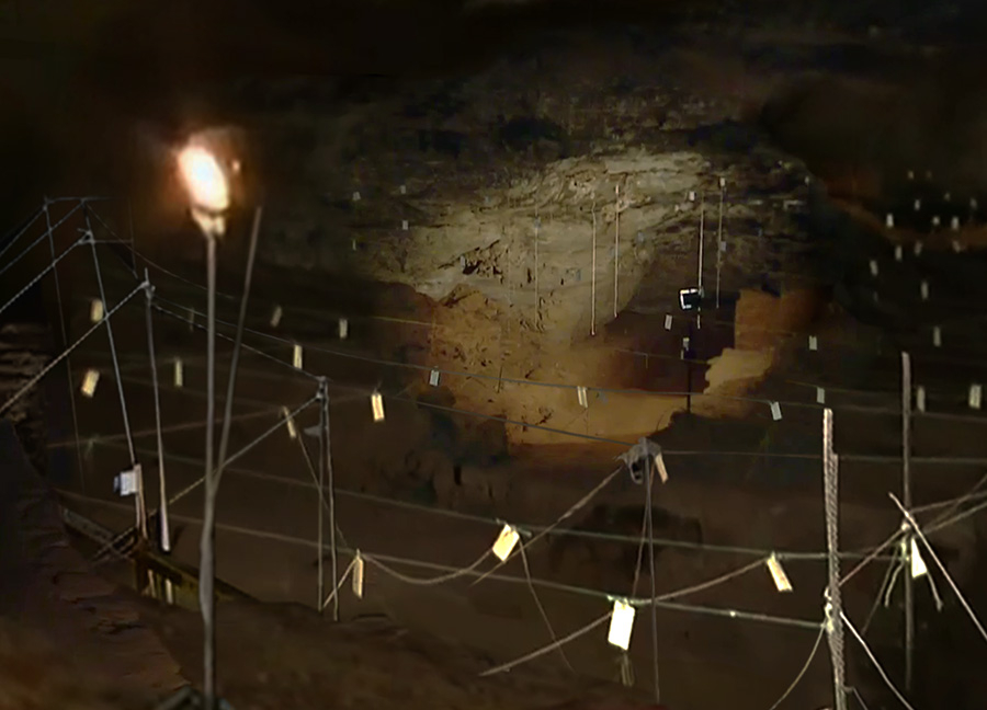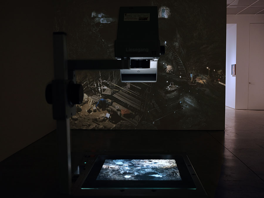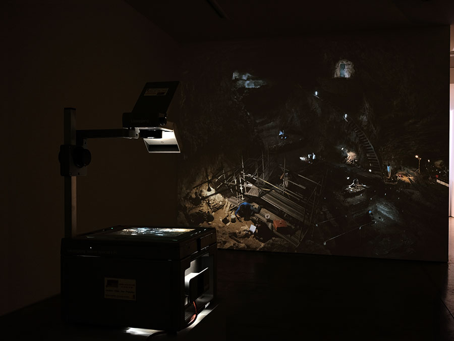 Ce matériau a ensuite été assemblé, par photomontage, pour reconstruire le site du premier feu, autour duquel toute la grotte et le processus de fouille se déploie. Il s’agit là d’un simple spot à droite dans l’image, éclairant une infime couche de carbone dans une paroi. Il apparait comme une trace lumineuse parmi les nombreuses autres lumières émises par les archéologues en train de chercher. Cette grande image numérique a ensuite été insolée et compressée via sont transfert sur un plan-film argentique. La diapositive disposée sur la dalle du rétroprojecteur, la projection amplifie l’image au mur, à une échelle qui rend visible le site du feu. Le dispositif de projection apparaît alors comme l’amplification inverse du premier feu - depuis une « nuit originaire » - trace éteinte dont le projecteur rejoue le foyer lumineux dans l’espace d’exposition. L’œuvre active un feu éteint, en donnant à voir le chemin d’un million d’années entre son invention préhistorique et l’ampoule électrique qui le fait apparaitre.