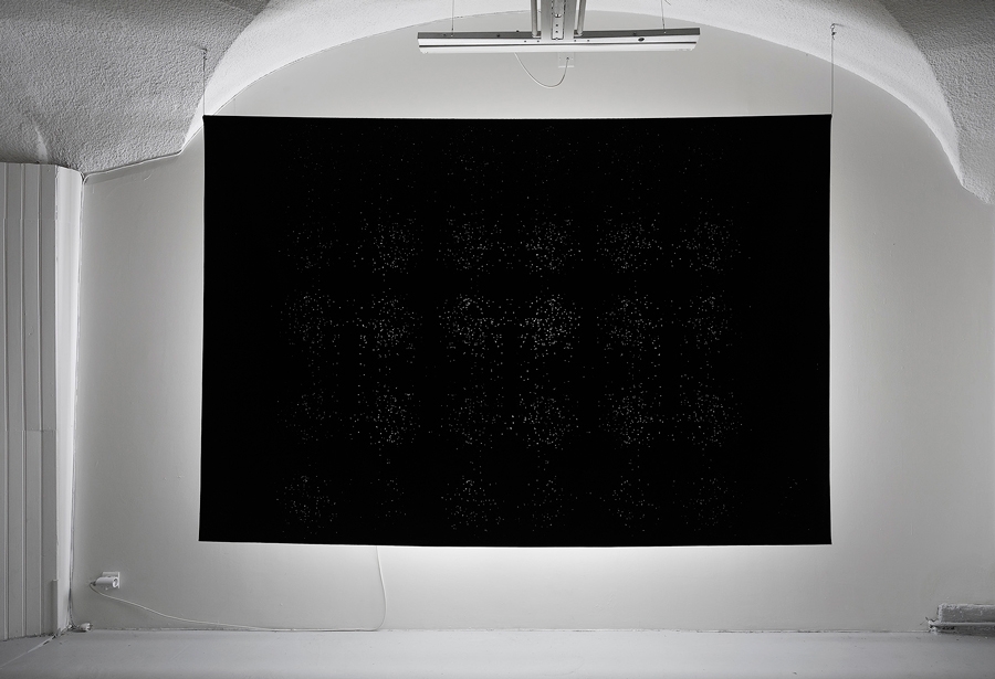« Si on le prend strictement dans le sens de son élaboration, le travail de Julien Audebert est un système nodal symptôme de l’entrelacement d’une multitude de références. L’œuvre se noue et se dénoue à travers un tissu de citations, de clins d’œil et d’emprunts puisés dans la culture savante ou populaire. En ce sens, si on souhaite dévoiler une partie de l’exposition Fort du taureau, il nous faut passer par la citadelle éponyme plantée dans la baie de Morlaix qui fut une prison dont Blanqui fut le dernier détenu. Depuis sa cellule, le célèbre communard rédige un texte à l’ambition scientifique, l’éternité par les astres où l’auteur défend les thèses mécanistes de l’époque. Composé d’un tissu noir criblé de plomb et retro-éclairé, Screenshot sequence s’apparente à une carte céleste qui n’est pas sans évoquer les recherches de Blanqui. Cette œuvre inédite est aussi un exemple de l’attachement de Julien Audebert pour la chronophotographie dont il fait lui-même l’usage. C’est ainsi que les différentes scènes de chasse extraites de La règle du jeu sont condensées en une seule image qui devient le théâtre d’une étrange situation où un nombre impressionnant d’animaux se font abattre.