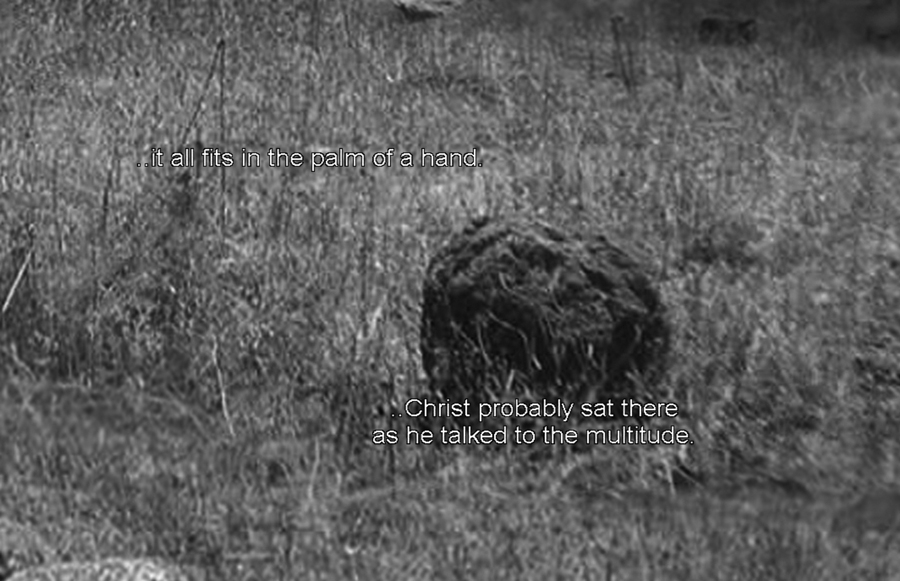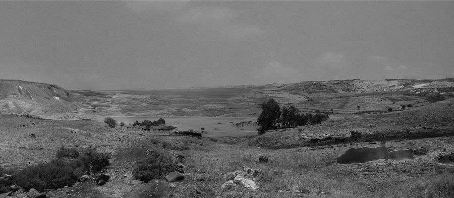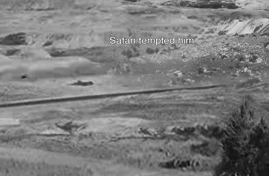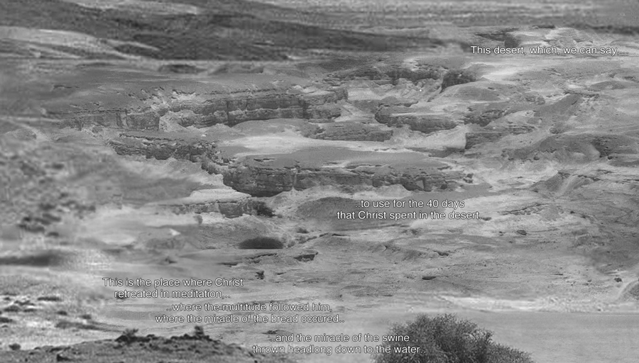 La photographie est une « reconstruction du désert » à partir du matériau pasolinien. Elle prend pour source ces images qui n’avaient pas trouvées leur but initial. Plus que la réalisation d’un « évangile photographique », l’image condense tout le voyage de Pasolini et du prêtre qui l’accompagne, depuis les rivages du lac Tibériade, jusqu’à Jérusalem et Bethléem, l’endroit où leur périple s’achève mais « où l’histoire commence ». Le paysage est essaimé par leur conversation (les sous-titres du documentaire ont été conservé), conversation qui porte sur les lieux et les moments clé de la vie du Christ, ou bien des considérations sur la transformation du paysage. Cohabitent alors récit théologique et géopolitique, à l’intérieur d’un paysage qui « tient dans la paume d’une main ».