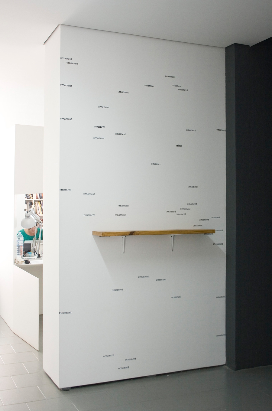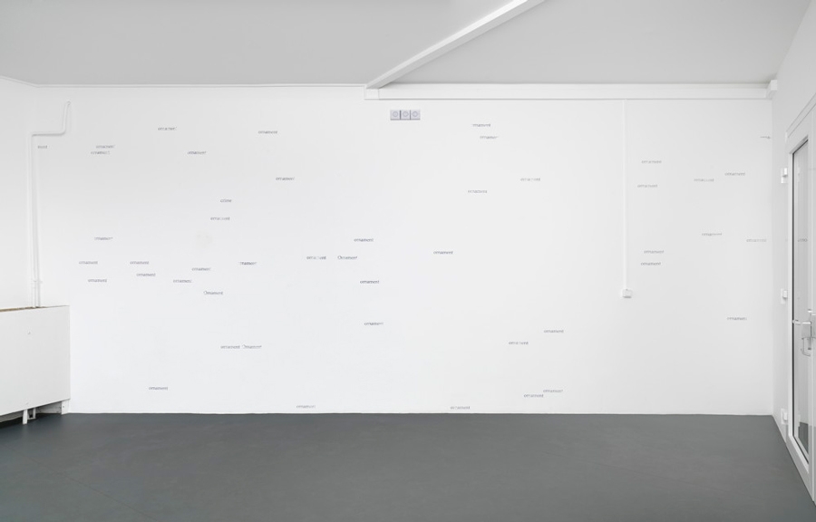 L'essai Ornement et crime de l'architecte Adolf Loos est le materiau premier de cette installation murale. Ce texte polémique et radical de la modernité, écrit au debut du XXe siecle, est ici transforme en fresque, ramené a une fonction ornementale. Mis en « page » à la mesure du mur, seuls les termes du titre (ornement et crime) sont inscrits avec un tampon, selon leur position et recurrence exacte dans le texte.